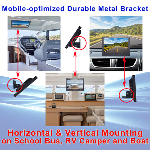 - 5. Construction-black Metal bezel and removable metal bracket. Mobile-optimized durable metal brackets; design for both horizontal and vertical mounting on vehicles, buses, and boats. Metal bezels can protect sensitive components or displays from damage or scratches. Standard VESA wall mount holes for wall mount installations.